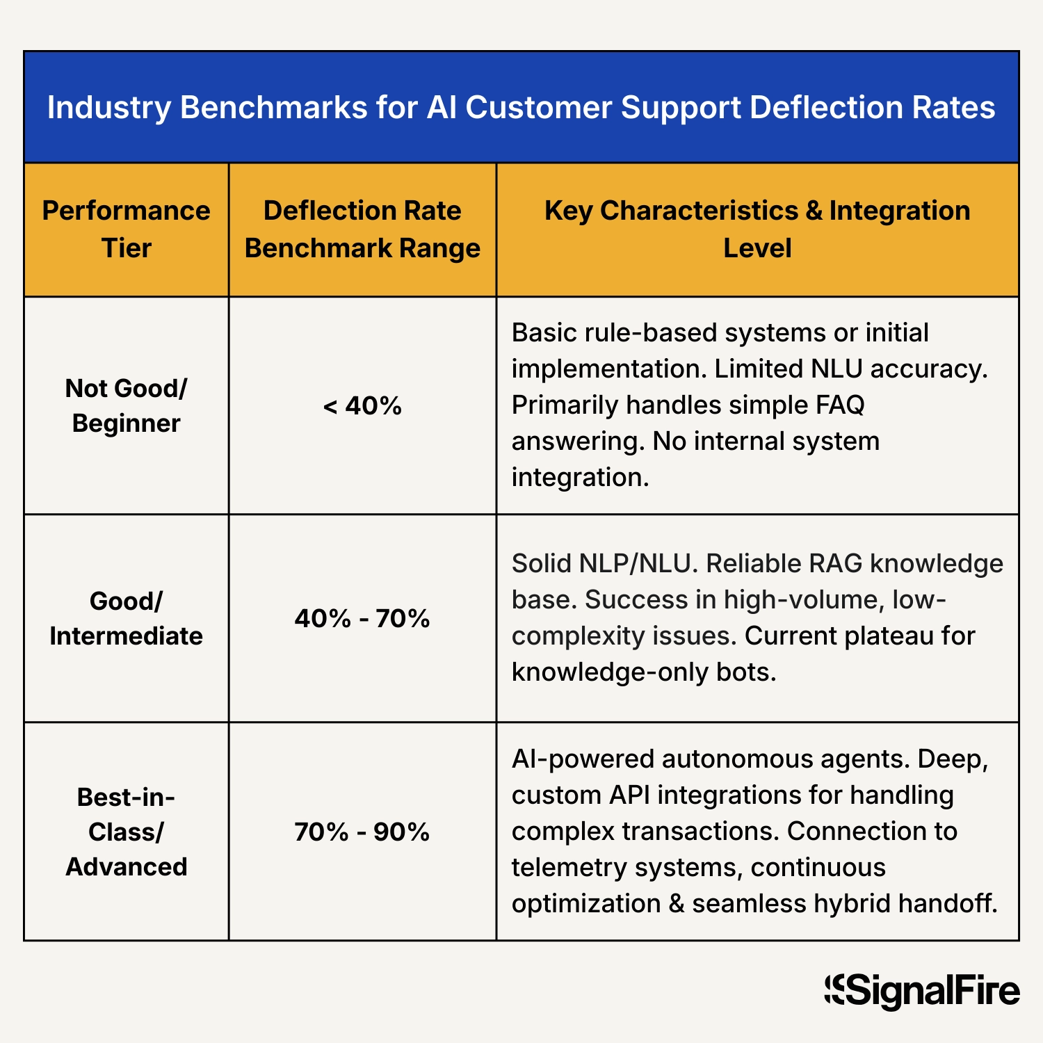 To escape the Intermediate performance tier (where the 50% resolution rate currently sits), organizations must benchmark against industry leaders who have integrated functional capabilities. The key metric is the Deflection Rate, which measures the percentage of issues resolved without requiring human escalation. Success requires a balanced KPI framework that includes Customer Experience (CSAT) and Operational Efficiency, as a high deflection rate is counterproductive if it traps frustrated customers.